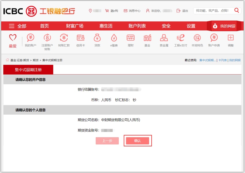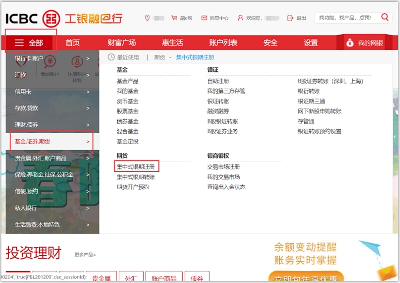 点击“全部”—“基金.证券.期货”—“集中式银期注册”;