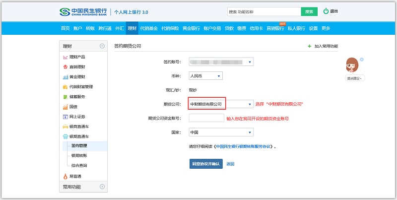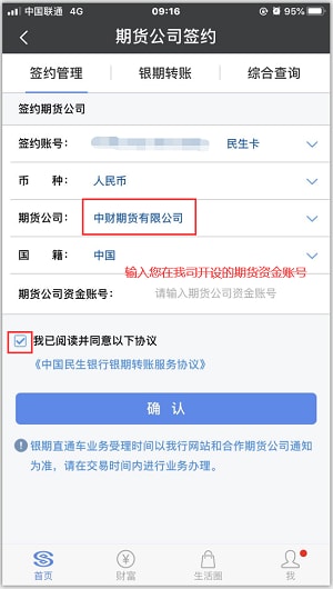选择“中财期货有限公司”,输入期货资金账号,阅读协议勾选确认;