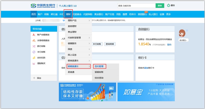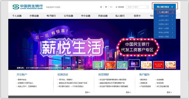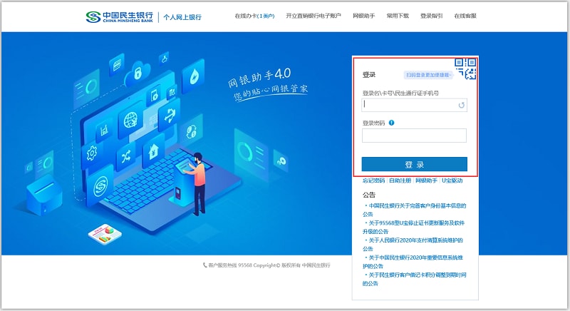 通过账号登录或扫码登录,登入民生银行个人网银;