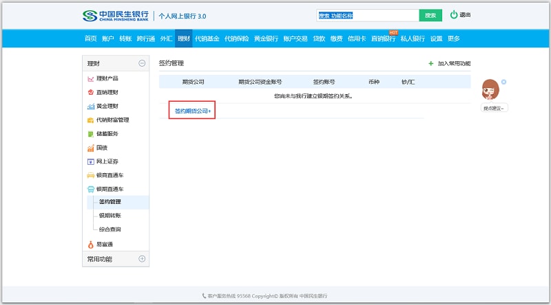 1、操作员:登录网银,财富管理→银期直通车→银期签约→点签约开始制单→按照页面提示选择资金账号、期货公司、开户证件→输入期货账号和资金密码→下一步在银期签约信息页面确认后选择“提交”按钮→提交成功后通知审批人。