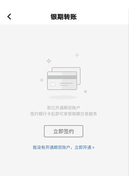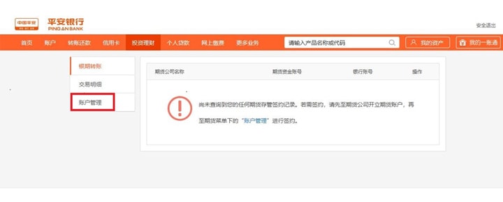 进入银期业务界面后,若尚未在期货公司有关联信息,会有相应提示,您可选择右侧“账户管理“进入签约界面。