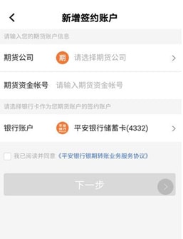 期货公司名称处选择“中财期货”,随后在期货资金账号处填写在我司获得的资金账号,勾选正方形方框“我已阅读并确认”,再点击下一步。