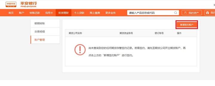 点击“账户管理“,在界面右上方会出现“新增签约账户”菜单,点击此菜单进入银期签约界面。