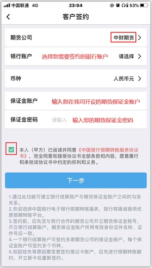 选择“中财期货”,输入保证金账户和密码,勾选协议,点击进入“下一步”;