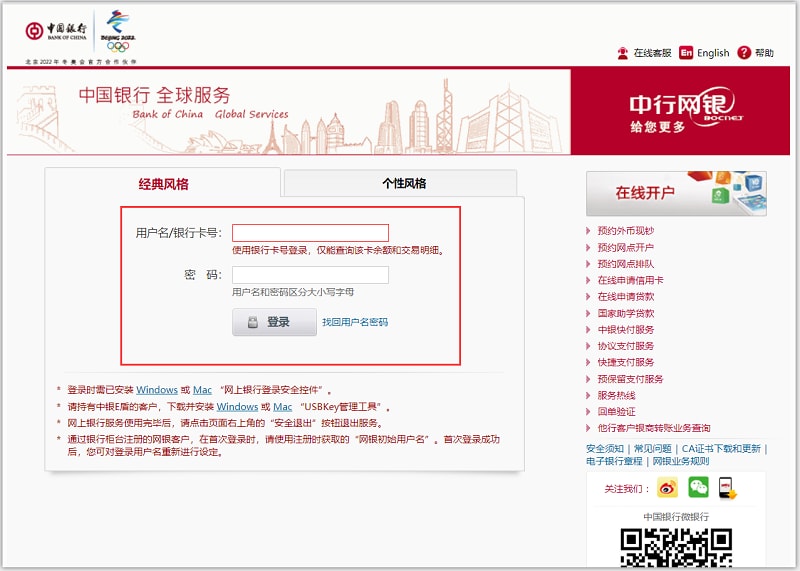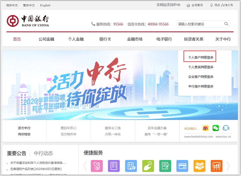 登录中国银行网上银行,选择个人客户网银登录(中国银行官方网址:http://www.boc.cn);
