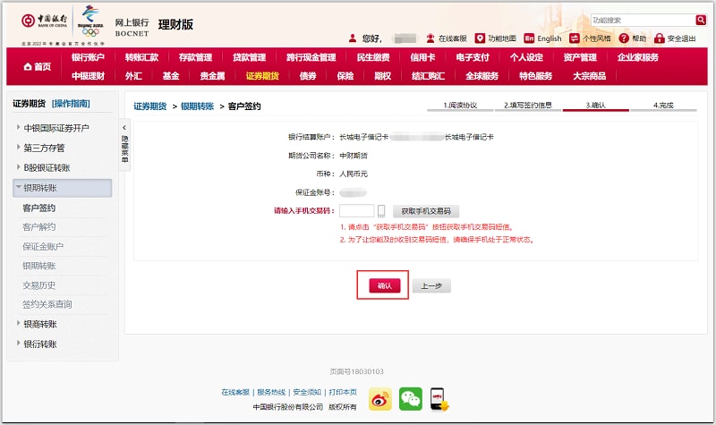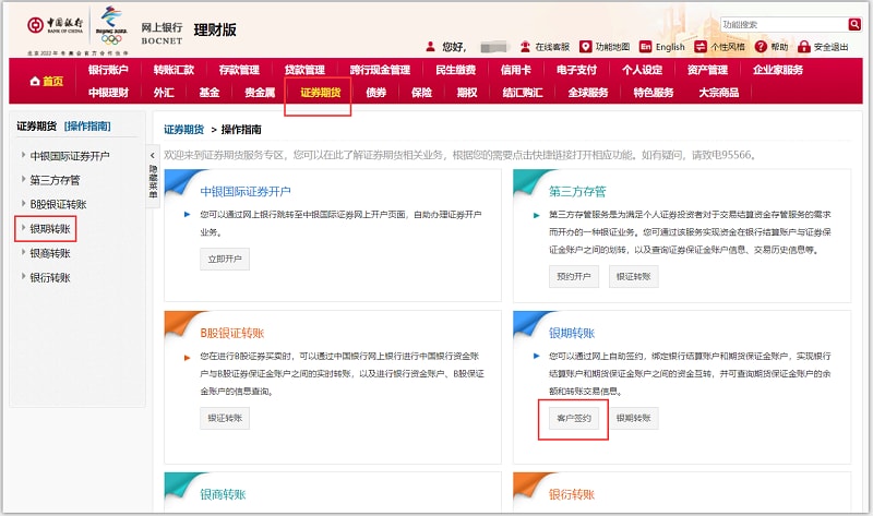 点击菜单栏“证券期货”,选择“银期转账”-“客户签约”;