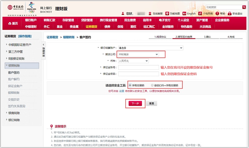 选择“中财期货”,输入保证金账号和保证金密码,进入“下一步”;