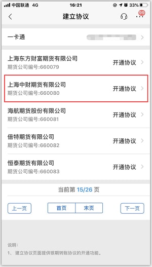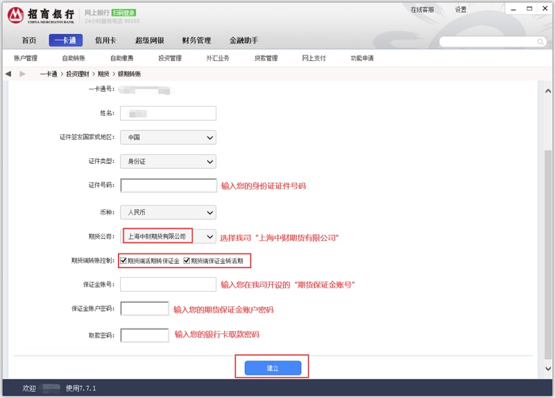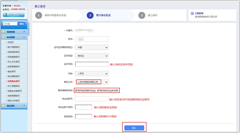 选择“中财期货”,输入期货资金账号、资金密码、银行卡取款密码等,点击“建立”进入下一步;