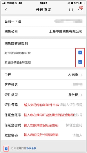 输入您在我司开设的期货保证金账号密码及其他相关信息,阅读协议并勾选确认,点击“确定”进入下一步;